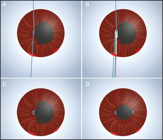 2 paracenteses are created and a 10-0 polypropylene suture attached to the long arm of the needle is introduced into the anterior chamber.